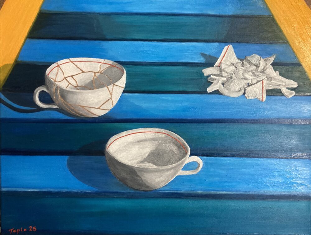 Dieses Werk reflektiert die emotionale Archäologie von Intimität. Inspiriert von der japanischen Technik des Kintsugi – der Kunst, zerbrochene Keramik mit Gold zu reparieren – begreift das Gemälde Brüche nicht als Scheitern, sondern als Transformation. Im Kintsugi werden Risse nicht verborgen, sondern hervorgehoben; sie werden zum wertvollsten Teil des Objekts.